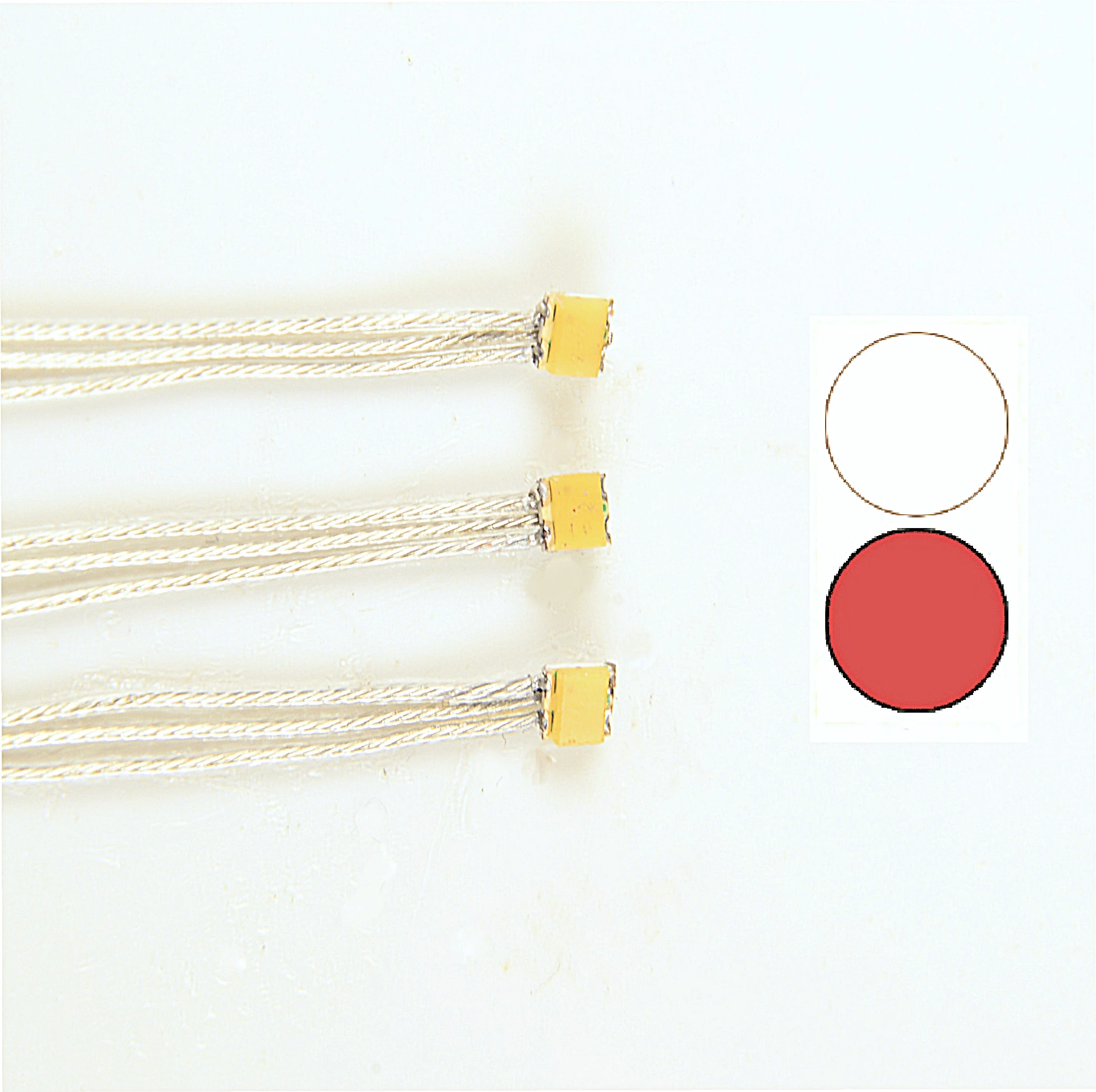 Bauform: 0605 Leuchtfarben: rot / warmweiß Stromstärke: pro Farbe ca. 20mA Spannung: warmweiß 3,3V / rot 2V Abstrahlwinkel: ca. 130° Leuchtstärke: rot ca. 112mcd und warmweiß ca. 350mcd Gehäuseabmessungen: L x B x H ca. 1,3mm x 1,6mm x 0,4mm mit ca. 20cm langer Microlitze ( Durchmesser nur 0,3mm )